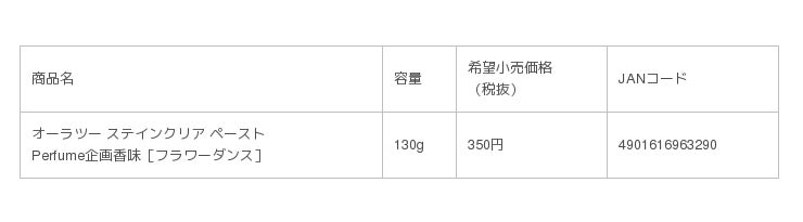 今回、「くちもとBeauty Project」のイメージキャラクターをつとめるテクノポップユニット“Perfume(パフューム)”プロデュースの限定品の発売が決定いたしました。パッケージデザインはもちろん、オーラツーステインクリアペーストの香味もPerfumeの3人がプロデュース。いつでも持ち歩きたい、使うと気分があがるアイテムが完成しました。7月中旬頃より全国の店頭にて販売いたします。