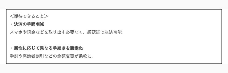 バスの乗車や降車時に、生体パスポートで乗車賃の支払いができるよう目指します。また生体パスポートに登録された年齢などの情報をもとに、学割や高齢者割引などにも対応していきます。