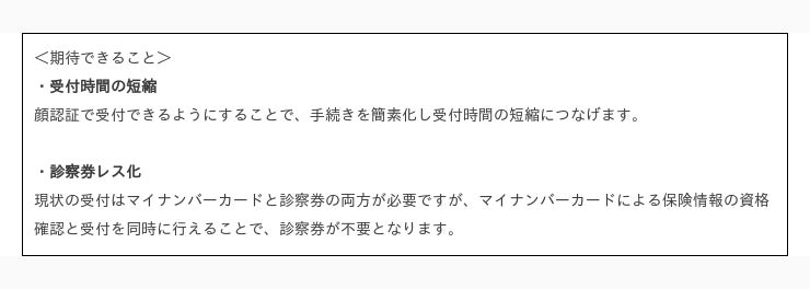 診察券の代わりに生体パスポートもしくはマイナンバーカードで受付できるようにし、診察券レス化を実現します。