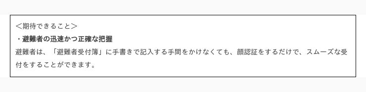 災害時の避難所に顔認証およびマイナンバーカードの読み取り可能な端末を設置し、生体パスポートもしくはマイナンバーカードによる緊急避難時の本人確認を可能にするとともに、罹災証明書の発行に登録データを活用します。