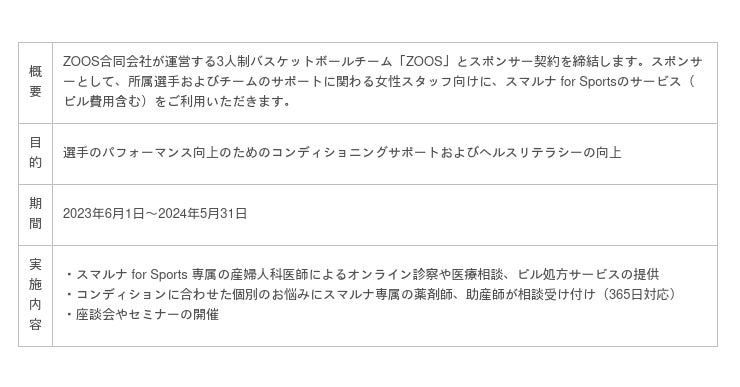 この度の取り組みでは、「ZOOS」所属選手と女性スタッフ向けに、スマルナ for Sportsの産婦人科医師が専属ドクターとして、オンライン診察やピルの処方サービスを提供し、一人ひとりのコンディションに合わせたご相談や悩みに寄り添いサポートします。さらに、スマルナに連携する助産師と薬剤師が365日オンライン医療相談を受け付けるなど、最適なタイミングで医療へ、そして婦人科へアクセスいただける環境を整えることで、予防医療の領域から健康課題に対し総合的にサポートします。