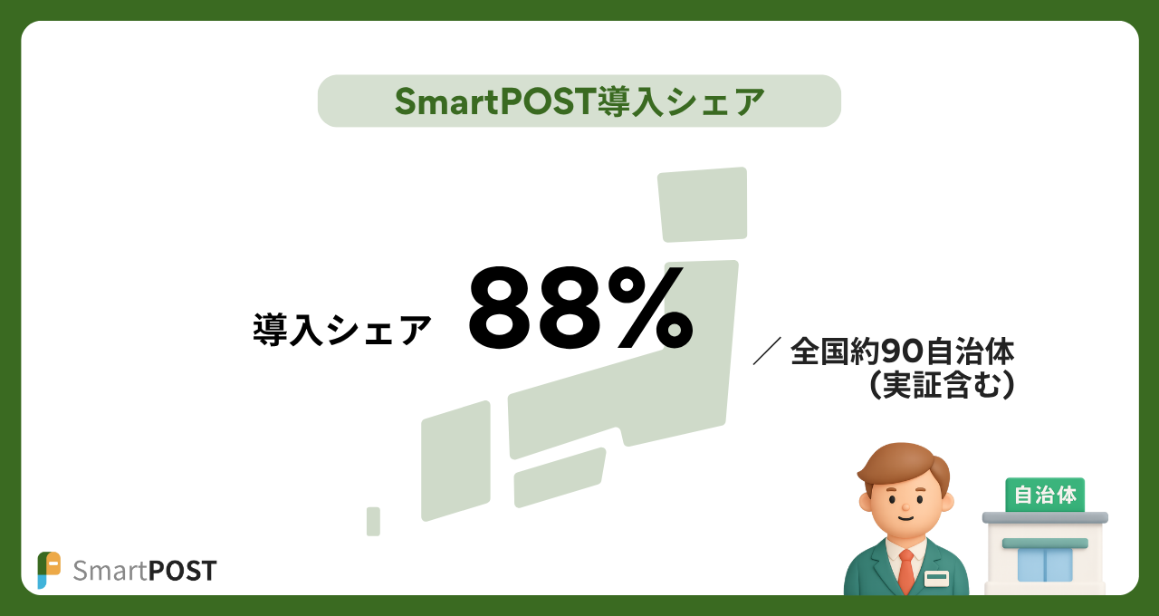 デジタル郵便サービスとしては、全国約90自治体で導入(実証含む)が進むなか、SmartPOSTはそのうち約80自治体で採用されており、導入シェア約88%を占めています。