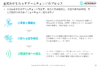 本資料では、GPT-4をはじめとする生成AIの急速な発展に関する直近のトピックに触れながら、生成AIによる価値の進化について分析。また、生成AIの革新によって起こるゲームチェンジについて考察し、これから日本の市場に迫る脅威の分析から、日本企業の生存戦略を提案します。