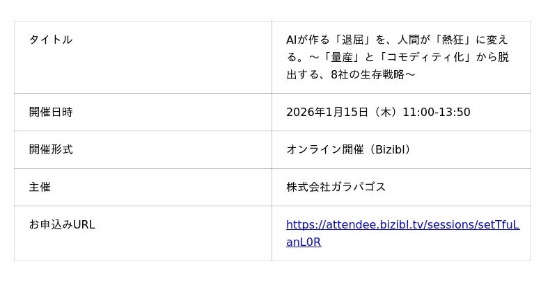 AIを活用した広告クリエイティブ制作・運用サービス「AIR Design」を展開する株式会社ガラパゴス(本社:東京都千代田区、代表取締役社長:中平健太)は、2026年1月15日(木)にオンラインカンファレンス『AIが作る「退屈」を、人間が「熱狂」に変える。〜「量産」と「コモディティ化」から脱出する、8社の生存戦略〜』を主催することをお知らせいたします。