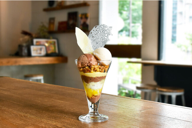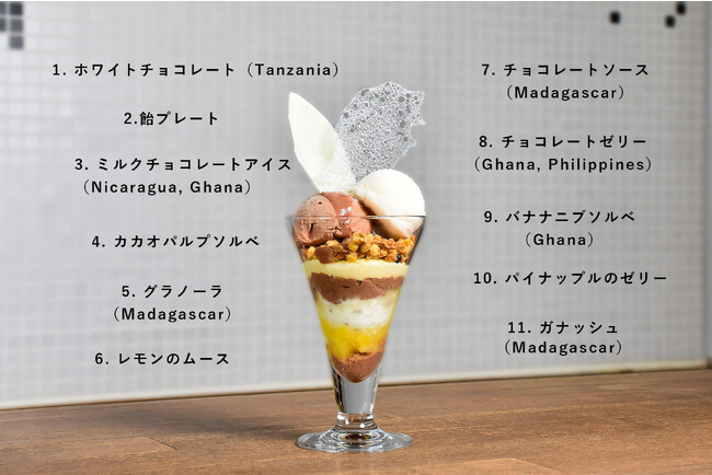 今回のパフェはそのカカオの果肉を使った、ライチのように爽やかな味わいのカカオパルプソルベをトップにのせることで、フルーツとしてのカカオを存分に楽しんでいただけるよう仕上げました。