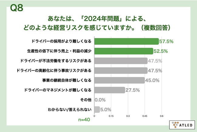 Q7で「非常に感じている」「やや感じている」と回答した方に、「Q8.あなたは、「2024年問題」による、どのような経営リスクを感じていますか。(複数回答)」(n=40)と質問したところ、「ドライバーの採用がより難しくなる」が57.5%、「生産性の低下に伴う売上・利益の減少」が52.5%という回答となりました。