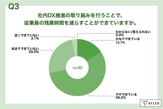 Q1で「かなり取り組んでいる」「やや取り組んでいる」と回答した方に、「Q3.社内DX推進の取り組みを行うことで、従業員の残業時間を減らすことができていますか。」(n=32)と質問したところ、「かなりできている」が15.7%、「ややできている」が56.2%という回答となりました。