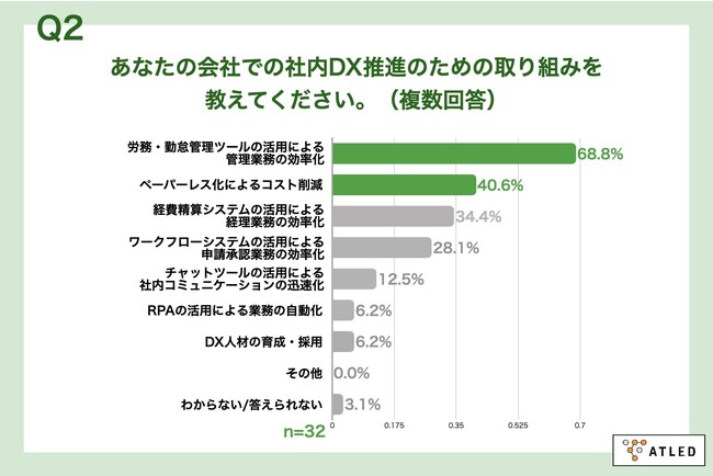 Q1で「かなり取り組んでいる」「やや取り組んでいる」と回答した方に、「Q2.あなたの会社での社内DX推進のための取り組みを教えてください。(複数回答)」(n=32)と質問したところ、「労務・勤怠管理ツールの活用による管理業務の効率化」が68.8%、「ペーパーレス化によるコスト削減」が40.6%という回答となりました。