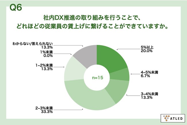 Q5で「かなりできている」「ややできている」と回答した方に、「Q6.社内DX推進の取り組みを行うことで、どれほどの従業員の賃上げに繋げることができていますか。」(n=15)と質問したところ、「5%以上」が20.0%、「4~5%未満」が6.7%という回答となりました。