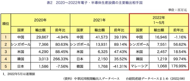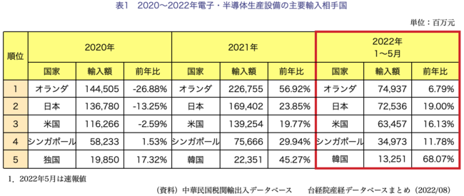 台湾当産業の22年1〜5月の国別輸入額は▽オランダ、▽日本、▽米国、▽シンガポール、▽韓国の順に多かった。(中略)