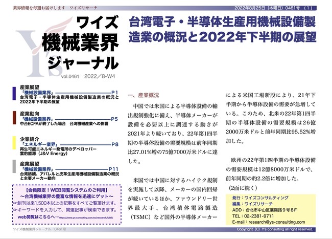 ワイズコンサルティング グループ(本社:中華民国台北市、代表取締役:吉本康志)は台湾機械業界専門誌「ワイズ機械業界ジャーナル」の2022年8月第4週号を発行しました。今週号では、台湾電子・半導体生産用機械設備業界、機械設備業界、再生可能エネルギー発電所のデベロッパーのJ&V Energyと紡績・アパレル業界生産用機械設の動向をご紹介します。