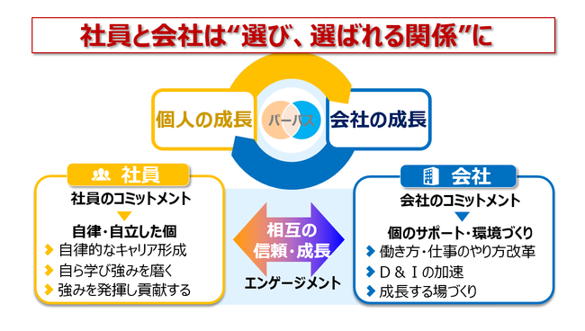 損保ジャパンは、2021年度を初年度とする3か年の中期経営計画において、「社員の幸せや働きがいをベースとして、保険事業とその先の安心・安全・健康の領域で、お客さまにとって価値ある商品・サービスを創造し、社会に貢献していく」ことをミッションとして掲げました。社員と会社が新たな「選び、選ばれる関係」を目指し、MYパーパスの取組みを軸に社員一人ひとりの成長と会社の成長の好循環を生み、相互信頼を高めてエンゲージメント向上を実現していきます。
