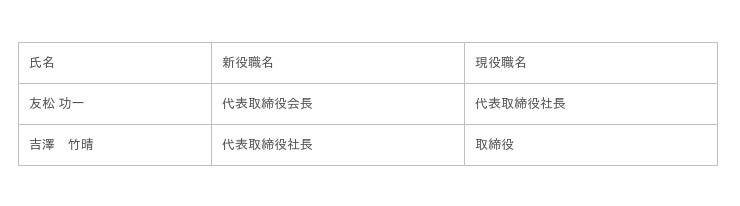 当社は、本日開催の臨時取締役会において、代表取締役の異動(追加選定)を決議いたしましたので、下記のとおりお知らせいたします。