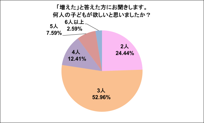 さらに「増えた」と答えた人に何人の子どもがほしいと思ったかを尋ねると、結果は「2人」(24.44%)「3人」(52.96%)「4人」(12.41%)「5人」(7.59%)、「6人以上」(2.59%)となり、「3人以上」と答えた人の割合の合計は75%以上。経済的な支援制度の充実が、1人頭の出生率に大きく影響する可能性を示唆する結果となりました。