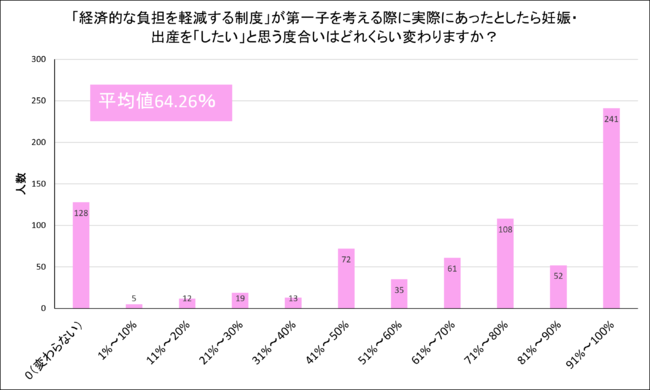 前段では、少子化支援を前提とした子ども1人の出産に対する理想の支援額80万円と、実際に子ども1人につき支給されている出産育児一時金42万円とを比較しましたが、出産育児一時金はあくまでも出産費用を補填するための支給金です。そこで、「経済的な負担を軽減する制度」が第1子を考える際に実際にあったとしたら、妊娠・出産を「したい」と思う度合いはどれほど変わったかを尋ねると、「約64%上昇する」という結果に。