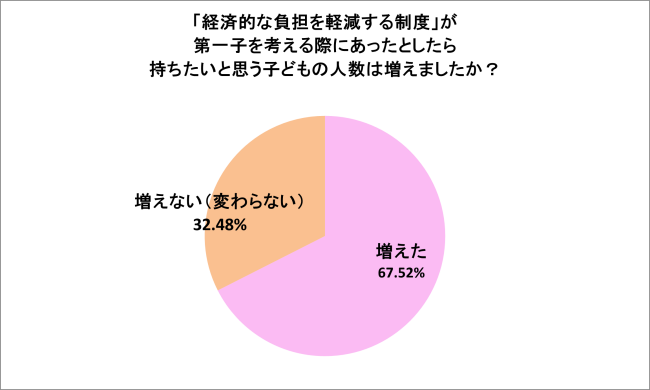 また、「経済的な負担を軽減する制度」が第1子を考える際に実際にあったとしたら、持ちたいと思う子どもの人数は増えたかを尋ねると、「増えた」(67.52%)「増えない(変わらない)」(32.48%)という結果に。