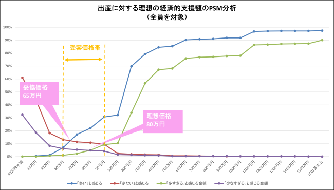 さらに、現在の子どもの人数が希望どおりのママに、「1人目を産もうとしていたとき」を振り返ってもらい、同様のアンケートをおこなったところ、「40万円未満では少ない」(39.1%)「40万円では少ない」(17.04%)「50万円では少ない」(25.76%)と感じる人の合計は全体の8割を超え、支援額のPSM分析結果においても、希望していた子どもの人数を断念したママと同様に「妥協価格は65万円」「理想価格は80万円」であることがわかりました。