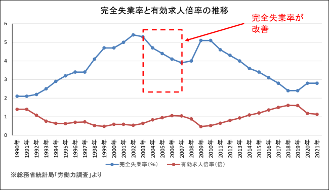 上記の表を見ると、2003年〜2007年には完全失業率が改善していることがわかります。