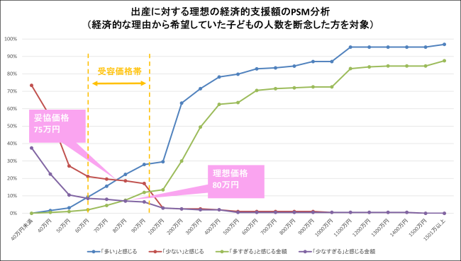 また、少子化支援を前提に1人の出産に対する支援額として、いくらでは多いと感じるか/少ないと感じるか/多すぎると感じるか/少なすぎると感じるかを尋ね、その回答をPSM分析したところ、子ども1人の出産に求める支援額の「妥協価格は75万円」「理想価格は80万円」であることが明らかになりました。