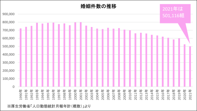 現状の女性人口を増やすことは不可能なため、どうしたらいいのか考え得る対策の中で取り組むべきことは、「出生率を上げること」と「婚姻数を増やすこと」だと考えます。日本はスウェーデンやフランスに代表される欧米諸国と比較し、婚外子(非嫡出子)に認められる権利が乏しいため、婚姻数の減少が出生数のマイナスに直結。これも、2021年の「人口動態統計月報年計(概数)」によると、日本の婚姻数は2013年以降、2019年には一時増加となりましたが、減少の一途をたどっています。