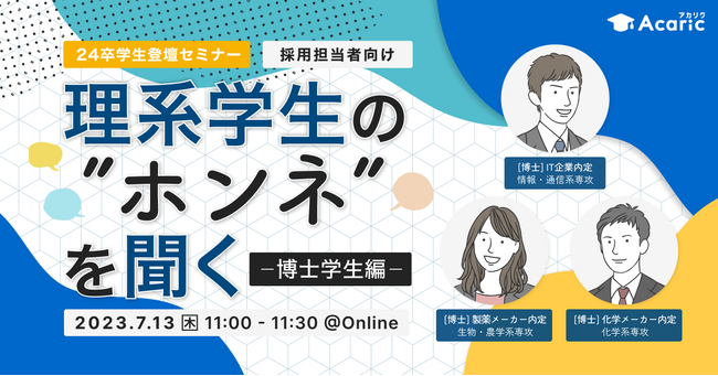 技術者・研究者に特化した採用・キャリア支援サービスを提供する株式会社アカリク(本社:東京都渋谷区、代表取締役:山田 諒、以下「弊社」)は、就活を終えた理系学生のリアルな声を聞くセミナー、「理系学生の ”ホンネ” を聞く」シリーズ第1回目にメーカーやIT企業への内定が決まった24卒博士学生3名をお呼びして「理系学生の”ホンネ”を聞く〜博士学生編〜」を開催いたします。