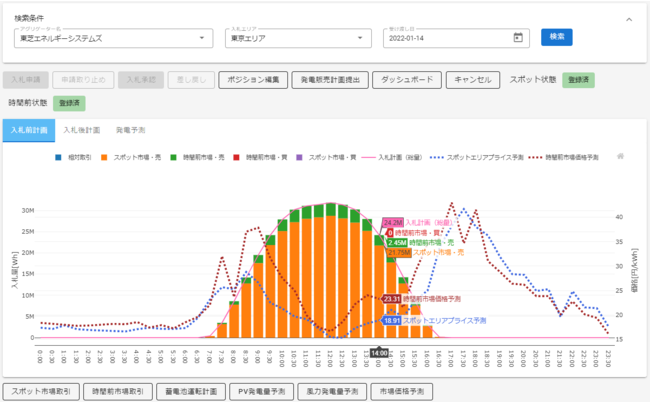 これらの実証では、ドイツのネクストクラフトベルケ社と共同で東芝ESSが開発したシステムを用いました。本システムを使うことで、発電量予測や発電量実績を画面で確認できます(図1)。また、予測結果に基づきエリア単位で作成される市場への入札計画を確認したり、実際に市場へ入札したりすることも可能です(図2)。
