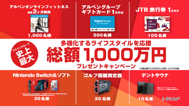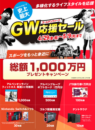 あわせて「スポーツをもっと身近に」のパーパスを実現すべく、昨今の多様化するライフスタイルを応援するために、GW期間限定の奉仕品の数々や各種企画をご用意するだけでなく、アルペングループとしても史上最大の総額1,000万円分のプレゼントキャンペーンを同時開催いたします。