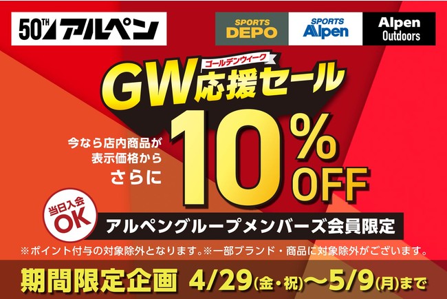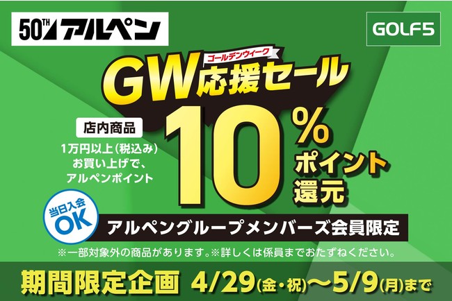 さらに、GWセール最大の注目は、スポーツデポ・アルペン・アルペンアウトドアーズでは「店内商品10%OFF」ゴルフ5では、1万円(税込)以上、ご購入のお客様「店内商品10%ポイント還元」を実施します。