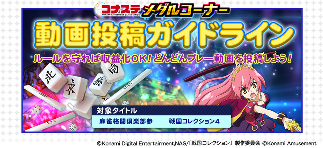 株式会社コナミアミューズメントは、「コナステ メダルコーナー」にて、以下の2タイトルで新たに「動画投稿ガイドライン」を公開したことをお知らせします。