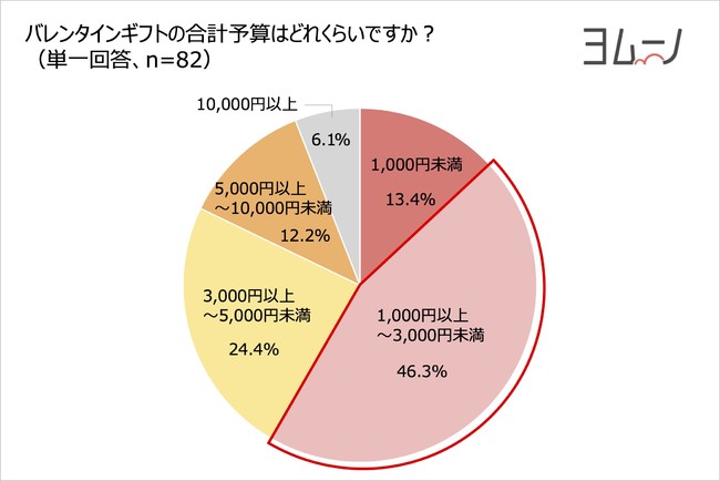 バレンタインギフトにかける予算総額を聞いたところ、「1,000円以上〜3,000円未満」との回答が46.3%で最多となり、次いで「3,000円以上〜5,000円未満」が24.4%となりました。また、平均は3,400円となりました。