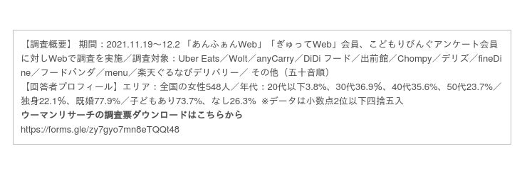 園児とママの情報誌「あんふぁん」「ぎゅって」を発行する株式会社こどもりびんぐ(所在地:東京都千代田区、代表取締役:中島一弘)は、 「シルミル研究所」としてリサーチ事業を展開しています。「シルミル研究所」では、全国の女性を対象にした調査「ウーマンリサーチ」を実施し、女性が選ぶおすすめの商品やサービスをランキング形式で、Webコンテンツとして発信しています。今回は2021年11〜12月に実施した「フードデリバリーサービスに関する調査」の結果を発表いたします。