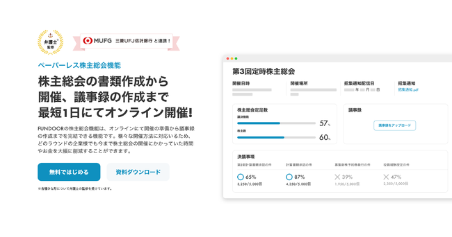 クラウド経営管理ツール「FUNDOOR」ペーパーレス株主総会機能の利用社数が70社オンラインで権利行使した株主数が3,000人に