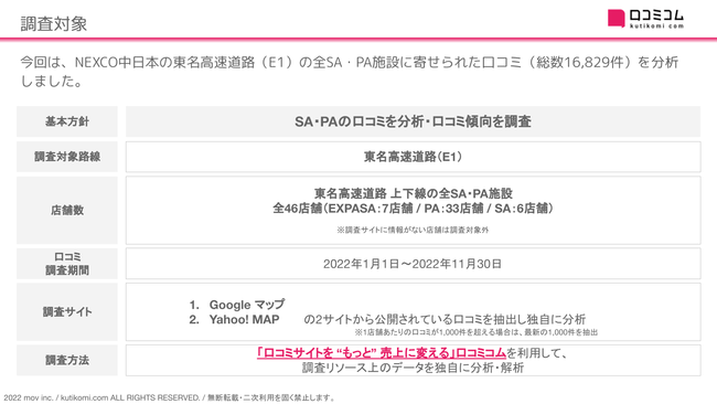今回は、NEXCO中日本の東名高速道路(E1)の全SA・PA施設に寄せられた口コミ(総数16,829件)を分析しました。
