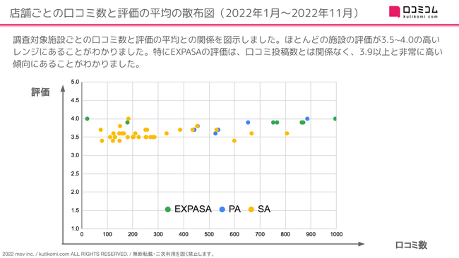 調査対象施設ごとの口コミ数と評価の平均との関係を図示しました。ほとんどの施設の評価が3.5~4.0の高いレンジにあることがわかりました。特にEXPASAの評価は、口コミ投稿数とは関係なく、3.9以上と非常に高い傾向にあることがわかりました。