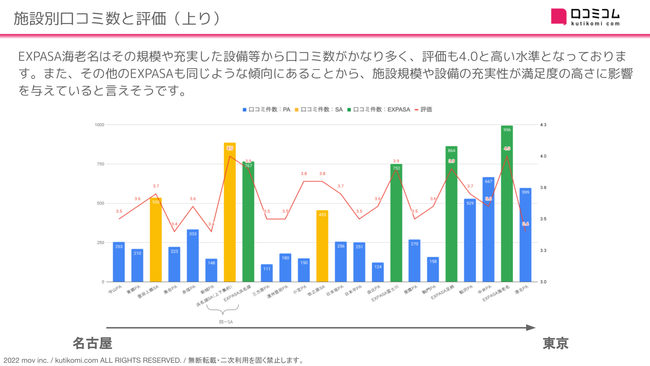 EXPASA海老名はその規模や充実した設備等から口コミ数がかなり多く、評価も4.0と高い水準となっております。また、その他のEXPASAも同じような傾向にあることから、施設規模や設備の充実性が満足度の高さに影響を与えていると言えそうです。