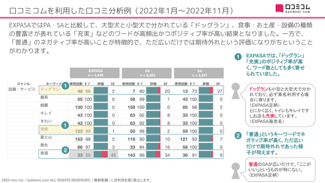 ・「ドッグラン」も多く言及されており、EXPASA人気の要因のひとつとなっていること