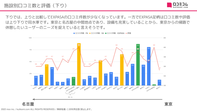 下りでは、上りと比較してEXPASAの口コミ件数が少なくなっています。一方でEXPASA足柄は口コミ数や評価は上り下りで同水準です。東京と名古屋の中間地点であり、設備も充実していることから、東京からの帰路で休憩したいユーザーのニーズを捉えていると言えそうです。