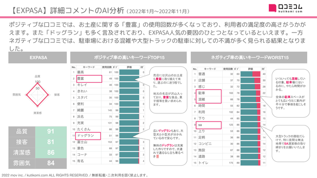 ポジティブな口コミでは、お土産に関する「豊富」の使用回数が多くなっており、利用者の満足度の高さがうかがえます。また「ドッグラン」も多く言及されており、EXPASA人気の要因のひとつとなっているといえます。一方ネガティブな口コミでは、駐車場における混雑や大型トラックの駐車に対しての不満が多く見られる結果となりました。