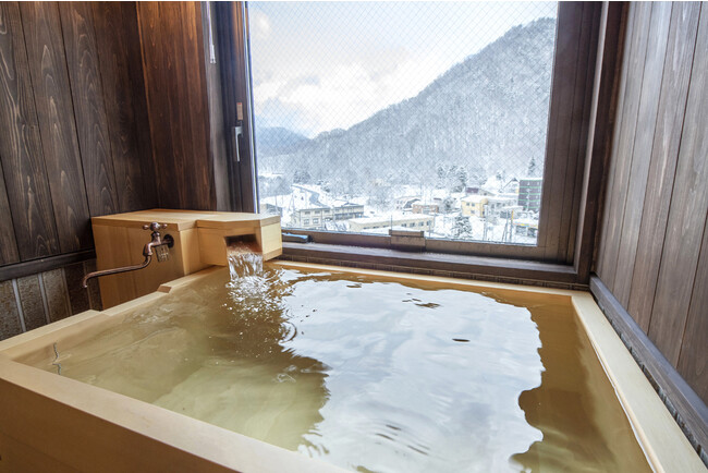 大浴場では、季節に彩られた山々を眺めながら天然温泉に浸かることができ、内湯(檜風呂・岩風呂)、露天風呂(寝湯・打たせ湯)、サウナ、岩盤浴、水風呂を完備しています。檜や陶器、岩造りの4つの貸切風呂は、無料で何度でもご利用でき、充実の湯めぐりをお楽しみいただけます。