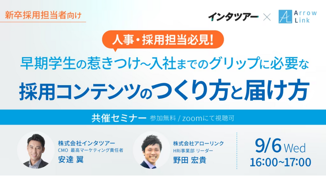 働くに関する社会課題をビジネスで解決するキャムコムグループの株式会社インタツアー(本社:東京都港区浜松町、代表取締役:作馬 誠大、以下インタツアー)は、2023年9月6日(水) 16:00 から、新卒採用担当者向けオンラインセミナー『人事・採用担当必見!早期学生の惹きつけ〜入社までのグリップに必要な採用コンテンツのつくり方と届け方』を開催いたします。