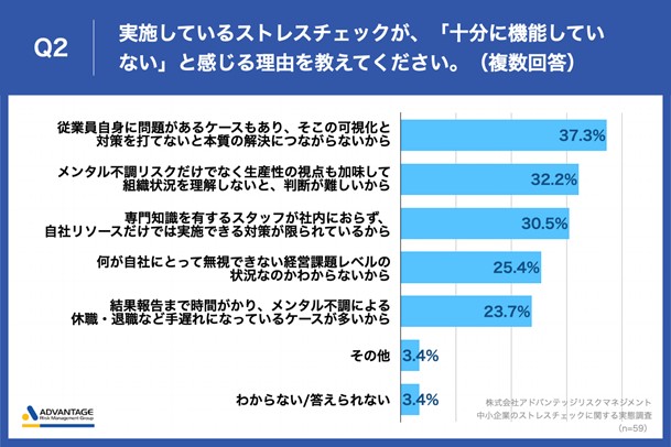Q1で「かなりある」「ややある」と回答した方に「Q2.実施しているストレスチェックが、『十分に機能していない』と感じる理由を教えてください。(複数回答)」(n=59)と質問したところ、「従業員自身に問題があるケースもあり、そこの可視化と対策を打てないと本質の解決につながらないから」が37.3%、「メンタル不調リスクだけでなく生産性の視点も加味して組織状況を理解しないと、判断が難しいから」が32.2%、「専門知識を有するスタッフが社内におらず、自社リソースだけでは実施できる対策が限られているから」が30.5%という回答となりました。
