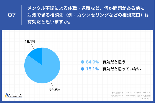 「Q7.メンタル不調による休職・退職など、何か問題がある前に対処できる相談先(例:カウンセリングなどの相談窓口)は有効だと思いますか。」(n=106)と質問したところ、「有効だと思う」が84.9%、「有効だと思っていない」が15.1%という回答となりました。