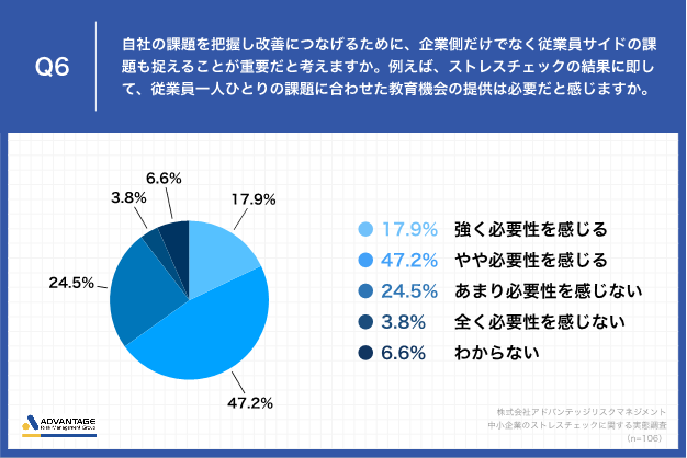「Q6.自社の課題を把握し改善につなげるために、企業側だけでなく従業員サイドの課題も捉えることが重要だと考えますか。例えば、ストレスチェックの結果に即して、従業員一人ひとりの課題に合わせた教育機会の提供は必要だと感じますか。(例:ストレスの理解と対処方法、エンゲージメント向上等)」(n=106)と質問したところ、「強く必要性を感じる」が17.9%、「やや必要性を感じる」が47.2%という回答となりました。