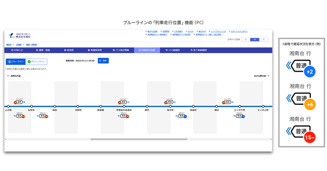 公式ホームページ上に「列車走行位置」タブを追加し、横浜市営地下鉄の列車種別や行先と合わせて走行位置を表示します。また遅延時には、列車アイコン上に遅れている時間と3段階(青:5分以下の遅延、黄:6〜14分の遅延、赤: 15分以上の遅延)で状況を可視化したり、列車アイコンをクリックするとその列車の停車駅の到着見込み時刻なども提示し、視認性の高い列車情報を提供しています。