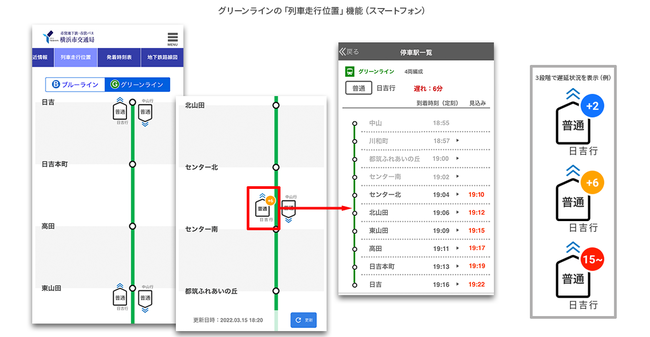 2015年9月より、横浜市交通局に鉄道・バス事業者向けソリューション「乗換・時刻表サービス」をご利用いただき、これまで乗換案内や時刻表検索などのコンテンツをホームページ上で提供しています。今回、横浜市交通局からGTFS・GTFSRTのデータを受領し、ナビタイムジャパンでは初めて「乗換・時刻表サービス」にて鉄道のGTFS・GTFSRTと連携した「列車走行位置」機能を開発しました。