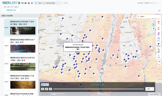 この度、浜松市ファンドサポート事業に採択されているトラジェクトリーが行う災害時の臨時ネットワーク網の構築を目的としたドローン実証実験の一環で、発災初動期(風水害)における状況把握手法の1つとして、当社のAIリスク情報(SNS)収集システム「FASTALERT」を活用します。