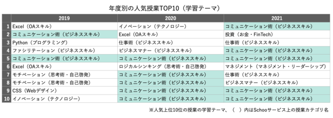 年度ごとの人気授業TOP10(※1)を授業カテゴリで比較すると、コロナ禍を経て「コミュニケーション術」をテーマにした「ビジネススキル」の授業が上位を多く占めるようになりました。「コミュニケーション術」の授業は、2019年は10位中2授業だったのに対し、2020年と2021年には10位中5授業がランクインしています。