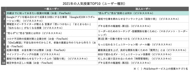 また、2021年に人気のあった授業第1位は、一般ユーザーでは「30歳までに知っておきたい投資の知識(https://schoo.jp/class/6672)」、法人ユーザーでは「“売らず”に“売る”技術とは何か(https://schoo.jp/class/4145)」となりました。