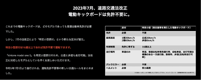 今回の改正道路交通法の施行に合わせ、以前から開発を進めていた新しい法律に適合する「Kintone model one S」の発売を決定しました。現行モデルのパワフルさを引き継ぎつつ、公道走行可能でより手軽に乗れるように設計しました。