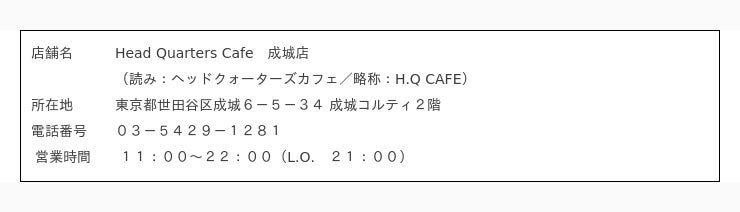 Head Quarters Cafe 成城店 店舗URL:https://www.odakyu-restaurant.jp/shop/hqcafe/seijyo.html